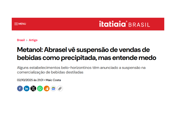 A rádio Itatiaia destacou nesta quinta-feira (2) a posição da Abrasel diante da crise de intoxicações por metanol. Alguns estabelecimentos em Belo Horizonte anunciaram a suspensão da venda de bebidas destiladas, mas a entidade considera a medida precipitada.